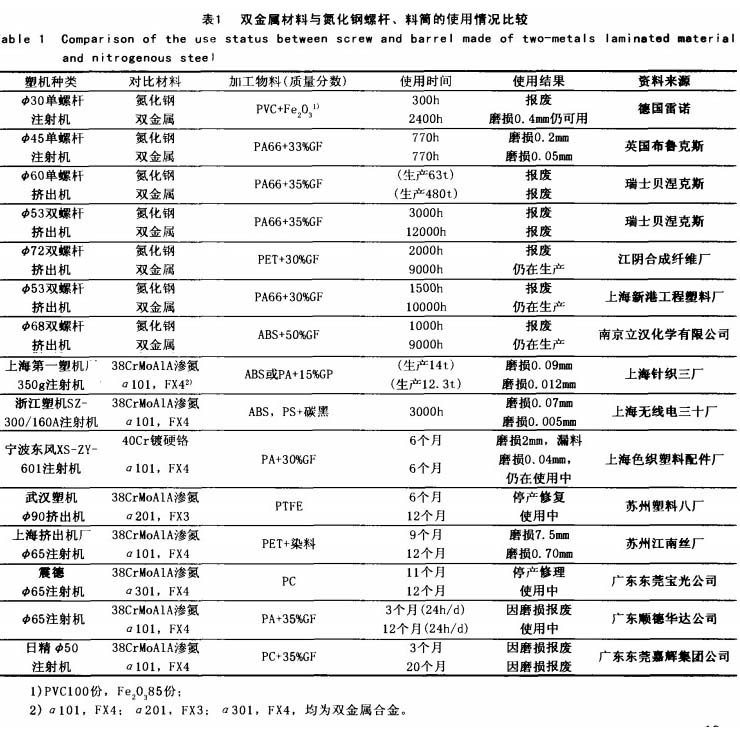 采用雙合金螺桿及雙合金料筒組裝的擠出機(jī)和注射機(jī),由于螺桿與料筒的耐磨性及耐腐蝕性好,其使用壽命比采用氮化鋼螺桿與料筒時(shí)的使用壽命要高得多。在表1中列舉了一些國(guó) 內(nèi)外有關(guān)單 提供的數(shù)據(jù),供讀螺桿的客戶參考。